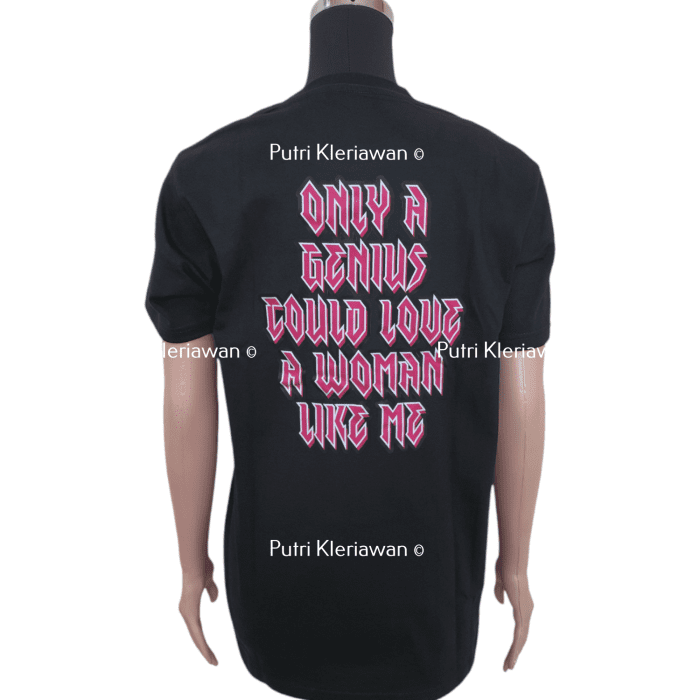 – Khusus design Genius terdapat 2 sisi gambar, yaitu sisi depan “GENIUS” dan belakang  ”ONLY A GENIUS COULD LOVE A WOMEN LIKE ME”.
